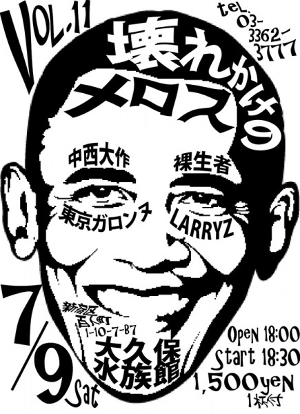 去年の11月以来実に8ヶ月ぶりの自主企画イベントであります。わりとひさびさな登場、しかも弾き語りの「中西'大作」、ベースレス編成での「LARRYZ」、そして今回初登場、ドラム、ギター、ダンサーという編成のジャムバンド「裸生者」、そして自分達ガロンヌの4本立てです。