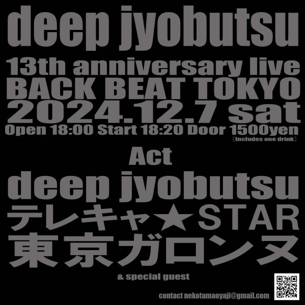 12/7、大塚BACK BEATで行われるdeep jyobutsu 13周年記念イベントに東京ガロンヌが出演します。